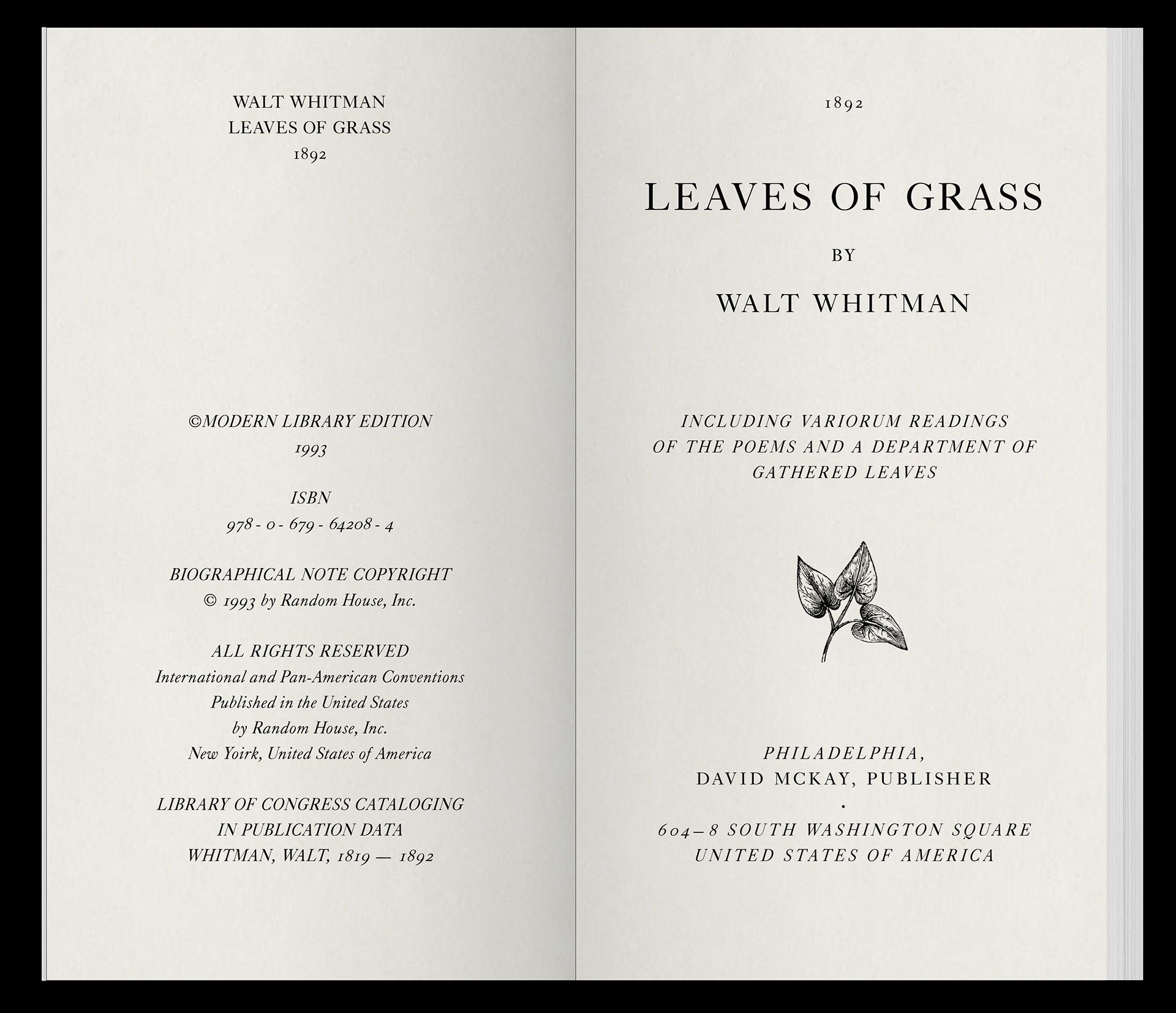 Frontispiece and colophon for Leaves of Grass by Walt Whitman (2020)