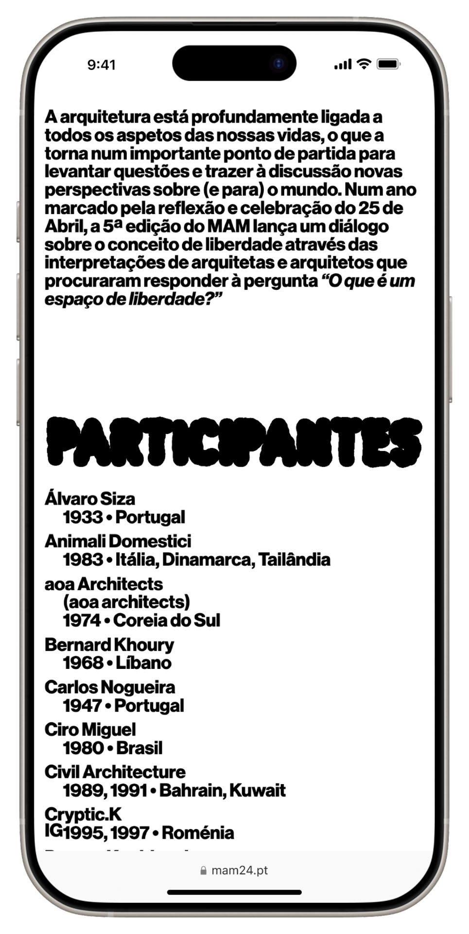 In 2024, as Portugal commemorates the 50th anniversary of its liberation from dictatorship, MAM (Maia Architecture Month) turns its gaze to the idea of freedom. Under the central question, "What is a freedom space?", the exhibition brings together 50 architects, thinkers, and visual artists to explore the complex, often elusive nature of this concept.